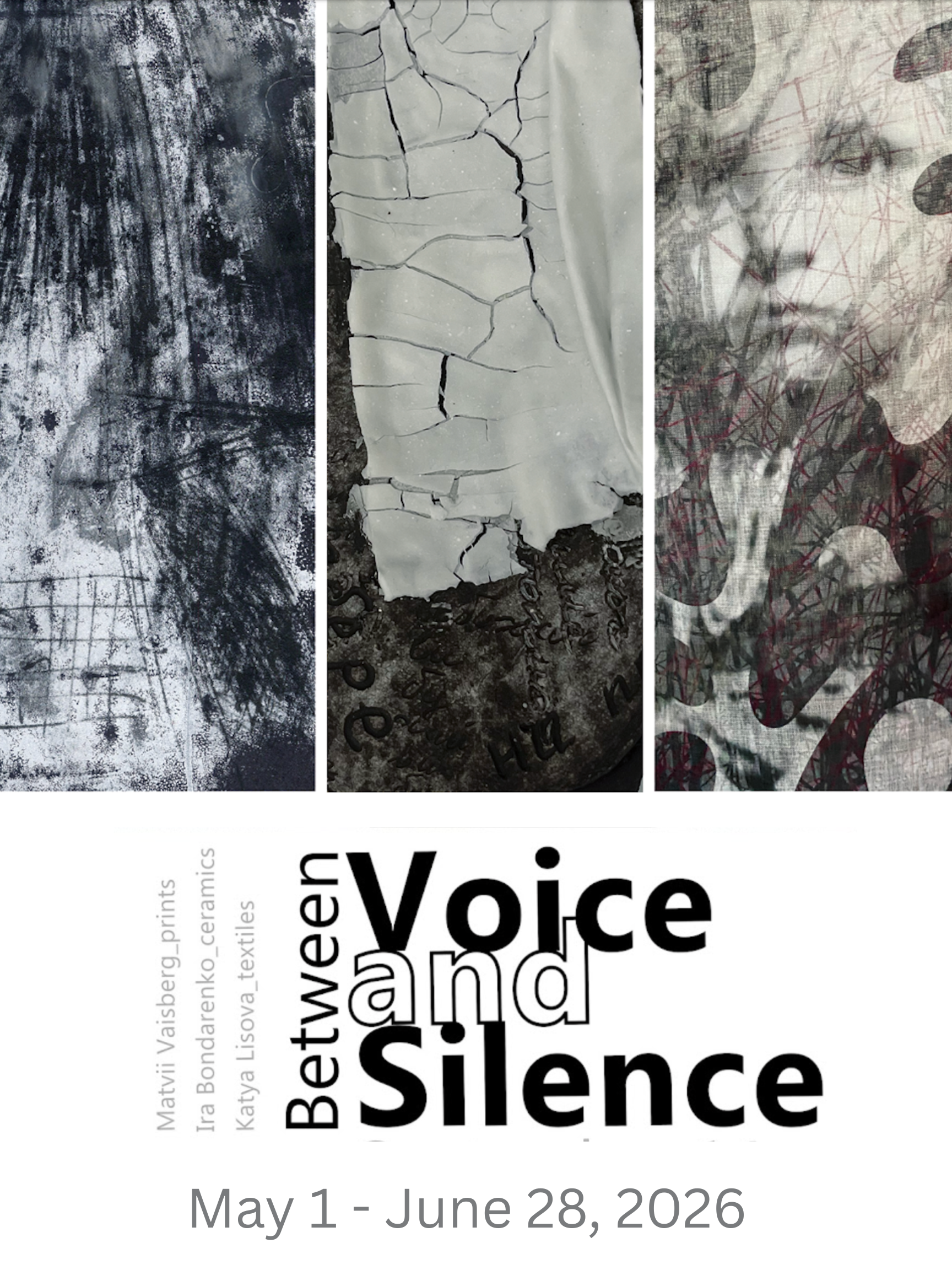 The exhibition ‘Between Voice and Silence' explores the role of empathy and humanity in times of crisis. Through their works, Ukrainian and American artists Katya Lisova (textiles), Matvii Vaisberg (prints), and Ira Bondarenko (ceramics) reflect on the limits and power of human agency in the face of overwhelming force. The value of humanity lies in its capacity to transcend adversity by embracing compassion and keeping empathy and human connection alive in the most oppressive darkness. The project examines this concept through the lens of works of Ukrainian artists and poets and emphasizes the role of ordinary people in building resilience and saving the state. The exhibition honors the poetry and life of Ukrainian fallen soldier Maksym Kryvtsov and, by drawing its title from one of his poems, “ In that space between Voice and Silence,” invites the audience to relate to this “in-between” moment where the power of the human heart reigns.