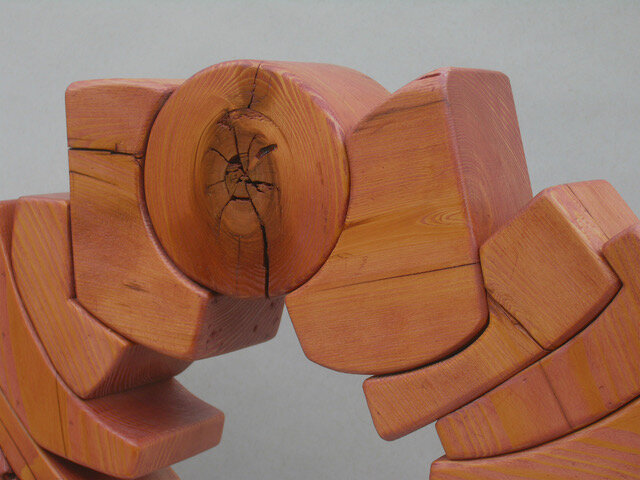 Bridge #2 speaks to our valiant efforts to stay connected to others while living in varying states of isolation. Most of the wood I use is reclaimed pine from old barns and urban “tear-downs.” I value the history embedded in the material and repurpose it into sculpture. This older pine has much denser grain and strength than recently harvested pine. It often has interesting knots and variations in the grain. I start with boards that are more than one inch thick. My sculptures are built from multiple elements carved on a band saw and assembled into final form. Bridge #2 began with a plan drawing, but improvisation also played a role during the process of creation. My intent is to create a sense of energy and life with this wood that once was a living part of our landscape.
